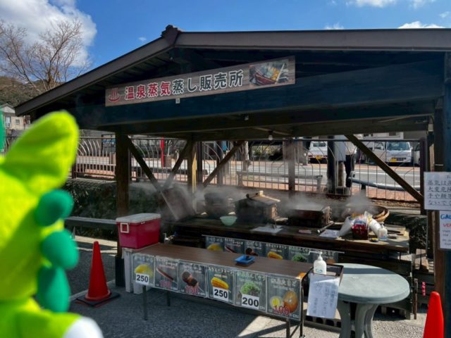 広場には「温泉蒸気蒸し販売所」があって、ここでは温泉の蒸気で蒸し上げた地元産の卵や野菜を楽しむことができるよ🥚🥬